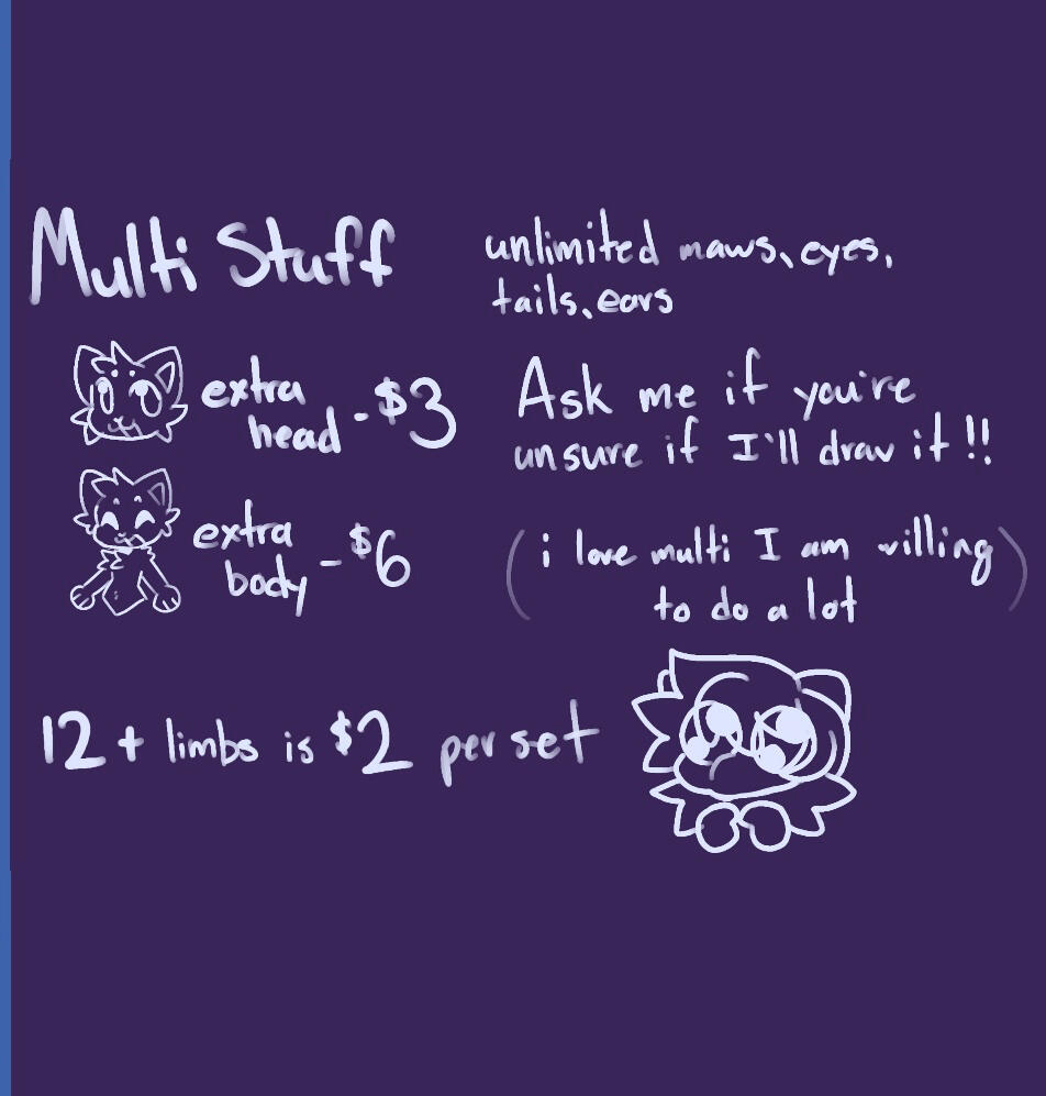 Here is my Carrd where you can see recent examples and my prices! I am easily contacted via Discord and BlueSky! Usernames for both are KatandStar154 (as well as all other socials!)